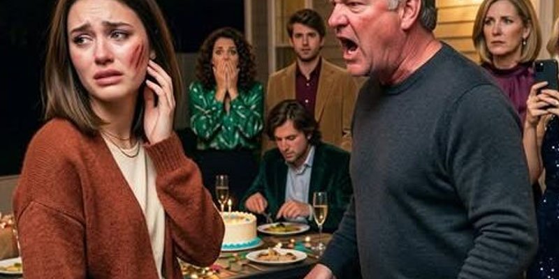 The sound cracked across the patio so sharply that every conversation stopped at once. One second I was standing there with the craft-paper package still half-open in his hand, and the next my face was burning, my head turned sideways, and a champagne glass had slipped from someone’s grip and shattered against the flagstones near my shoes.