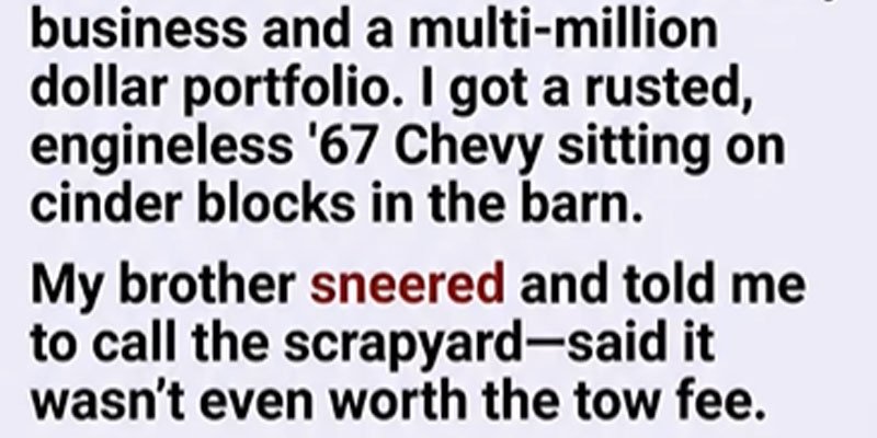 I sat back on the dusty barn floor, the silence of the afternoon suddenly feeling electric. For weeks, I had listened to my brother’s smug voicemails, offering to lend me fifty bucks for the tow truck out of “pity.” I looked at the ledger, then at the rusting metal shell of the ’67 Chevy.