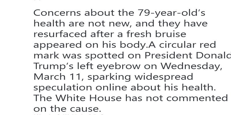 The eyebrow mark comes just days after another visible bruise drew attention online. On March 2, during a Medal of Honor ceremony held in the East Room of the White House, Trump was also photographed with a bruise on his neck. It rose above the collar of his shirt and stopped just under his ear.