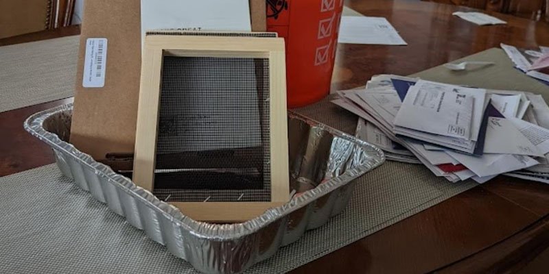 The kit comes with instructions and a variety of different additives you can put in your paper. It also comes with the wooden deckle you use to make your sheets. Deckles themselves come in all shapes and sizes. In addition to the kit’s contents, you’ll need a pan for papermaking, a bowl or bucket big enough for soaking your paper in, and your stash of paper. The paper shouldn’t be glossy or have too much ink on it. If you’re looking for colorful paper, try adding different color papers. Construction paper or colored printer paper is also an option you can add.